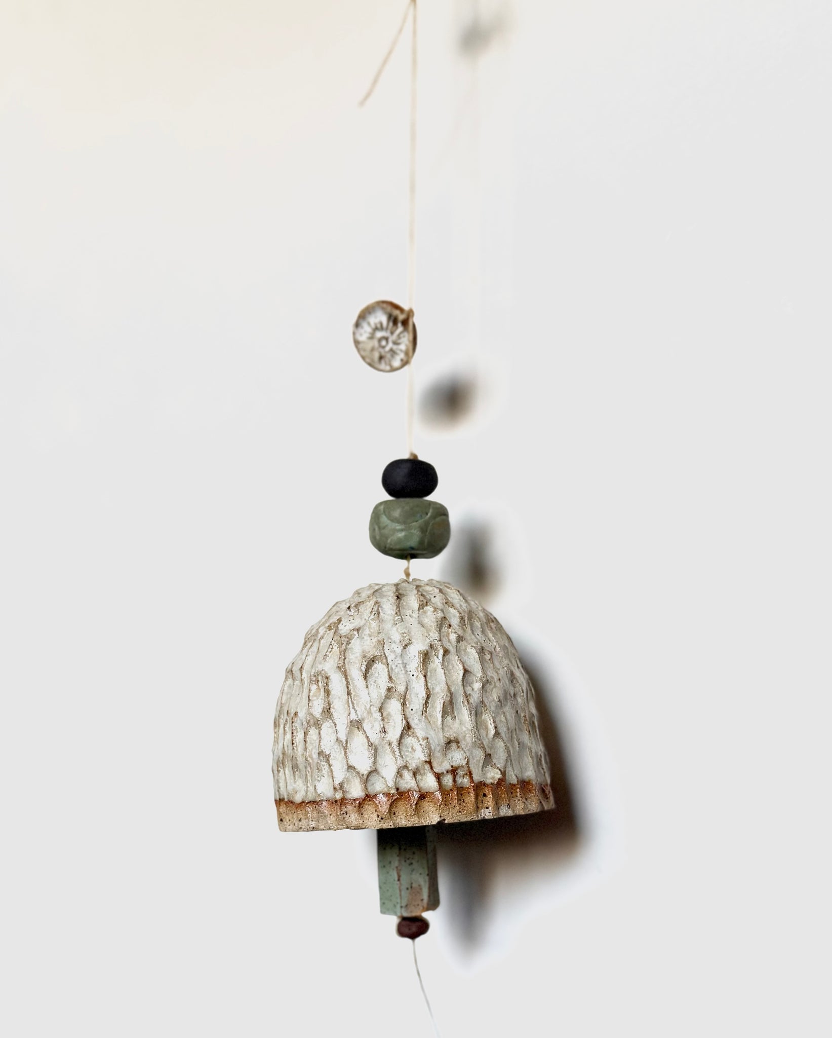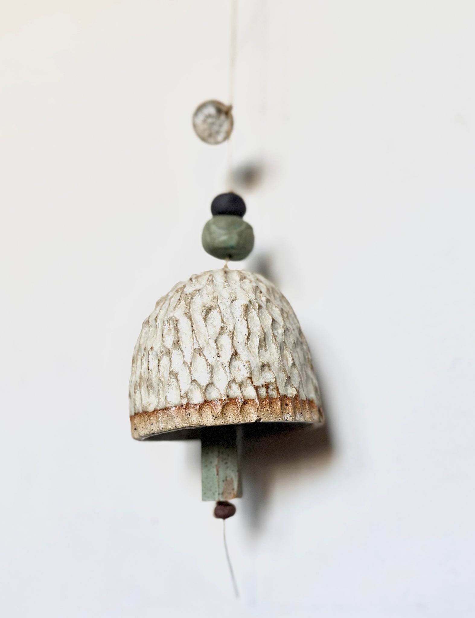 Hand pinched belle with individually hand crafted ceramic beads, strung with care on linen thread. Each belle has its own unique chime. Stoneware clay, matte glaze. Belle approximately: 3" x 3 1/2” beads hang 2"-4". Length of hangers vary.
