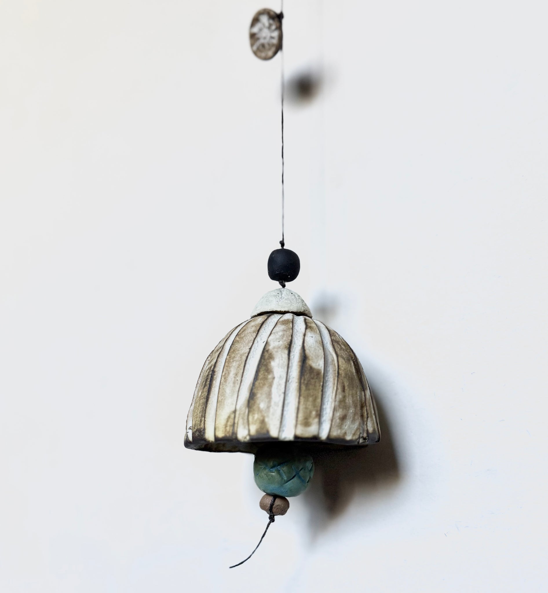 Each belle is hand-pinched from stoneware clay, glazed in a soft matte finish, and adorned with individually crafted ceramic beads, strung on linen thread. Every chime has a unique tone and character.