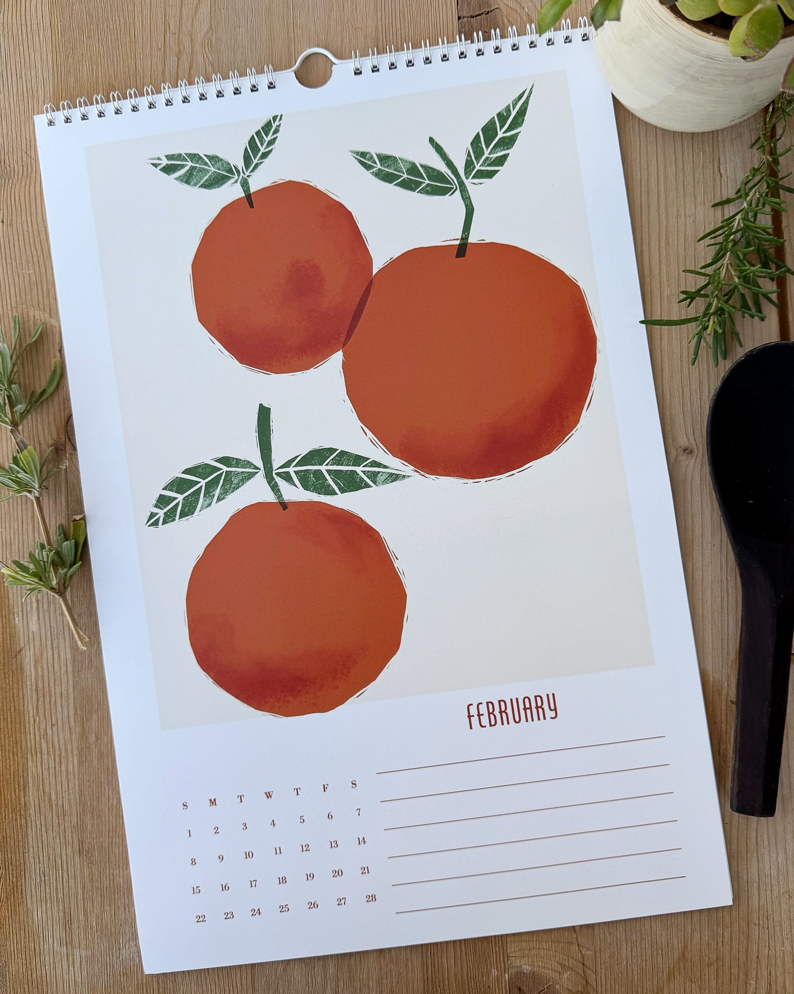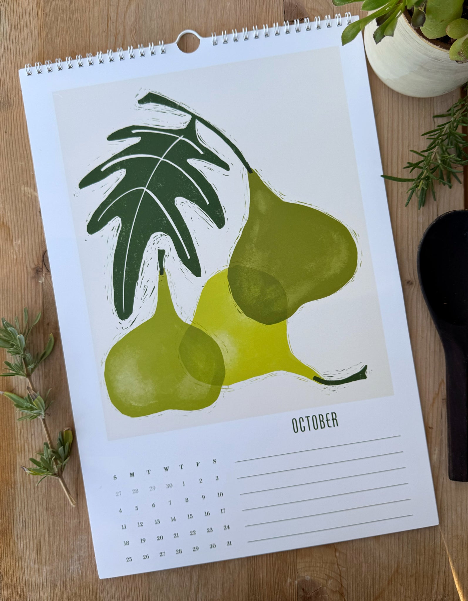 This 12 month wall calendar features my original block print style illustrations of fruit I foraged throughout the year. Simple, graphic, and rooted in seasonality, each image brings a quiet natural presence into everyday spaces.