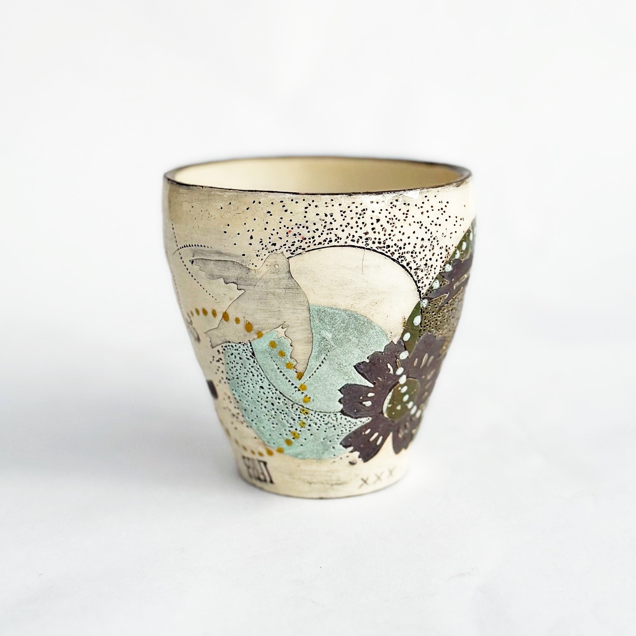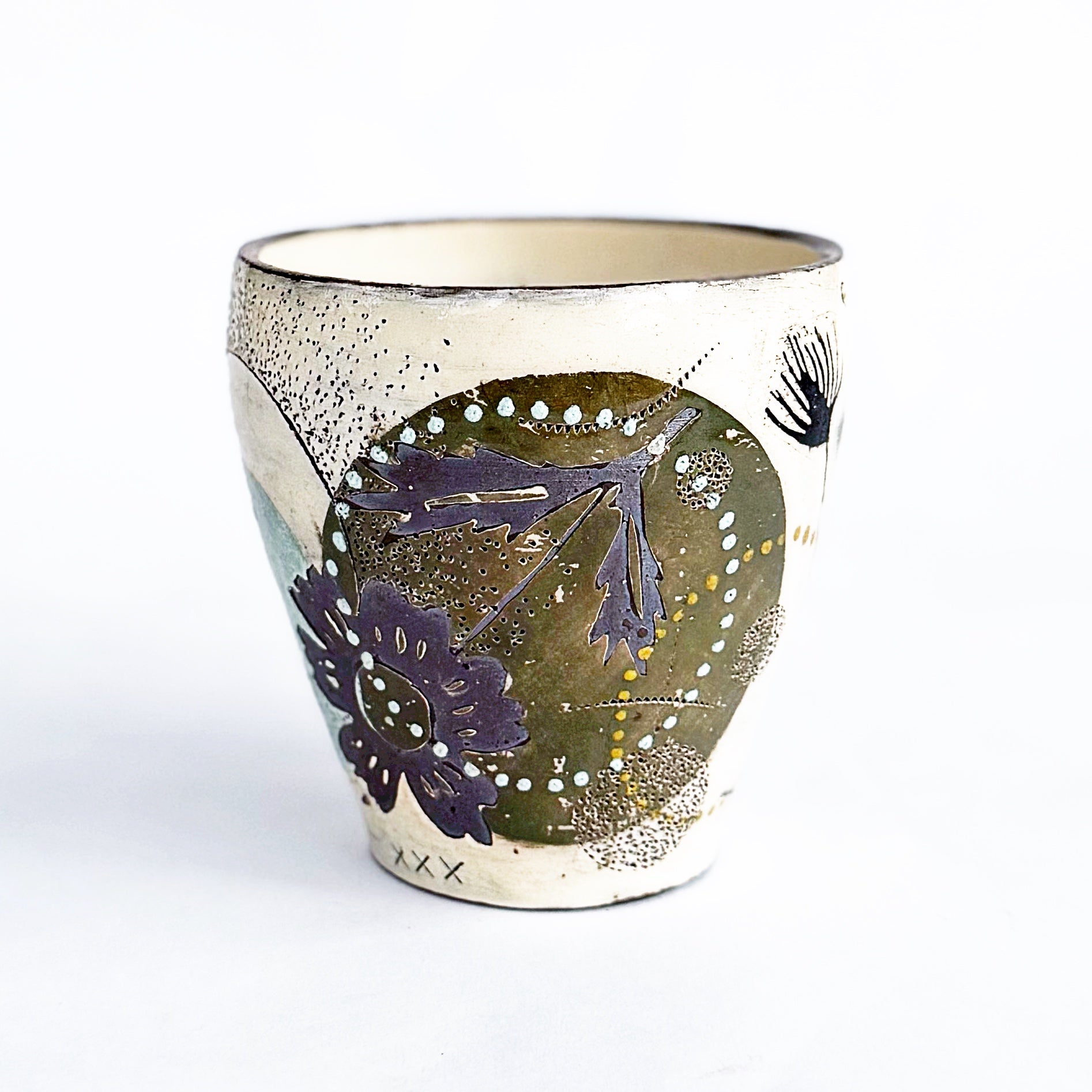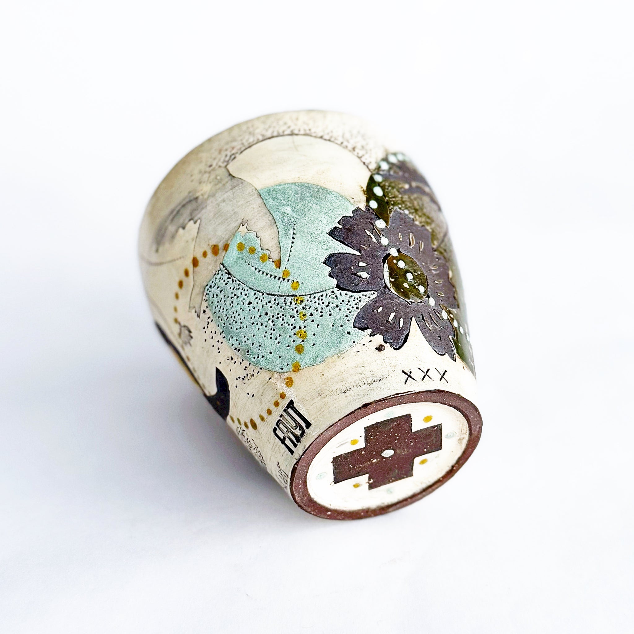 One of a kind, wheel thrown chocolate brown stoneware clay, decorated with hand cut stencils of my original drawing using slips, underglaze, underglaze transfers, hand etching, stain and glaze. Fired to ^6.