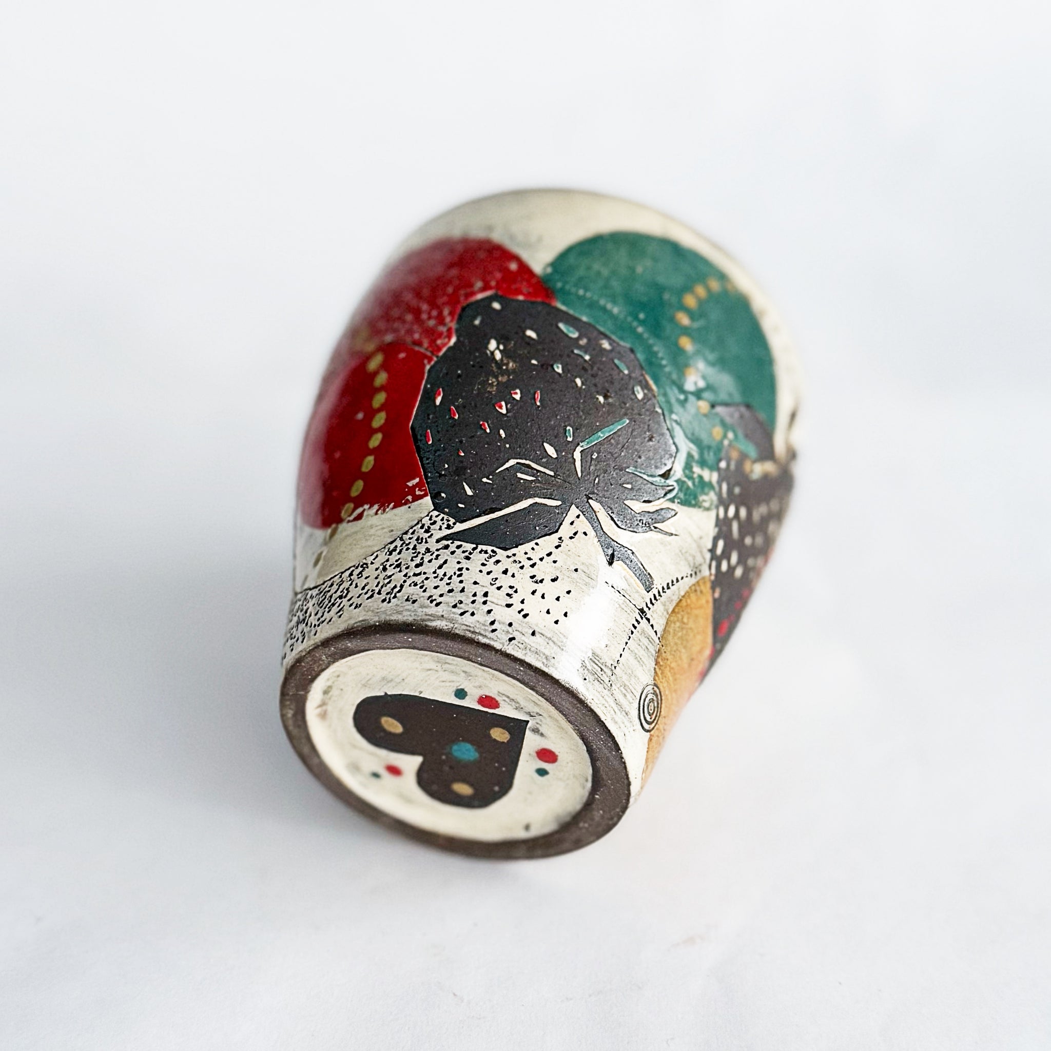 One of a kind, wheel thrown chocolate brown stoneware clay, decorated with hand cut stencils of my original drawing using slips, underglaze, underglaze transfers, hand etching, stain and glaze. Fired to ^6.
