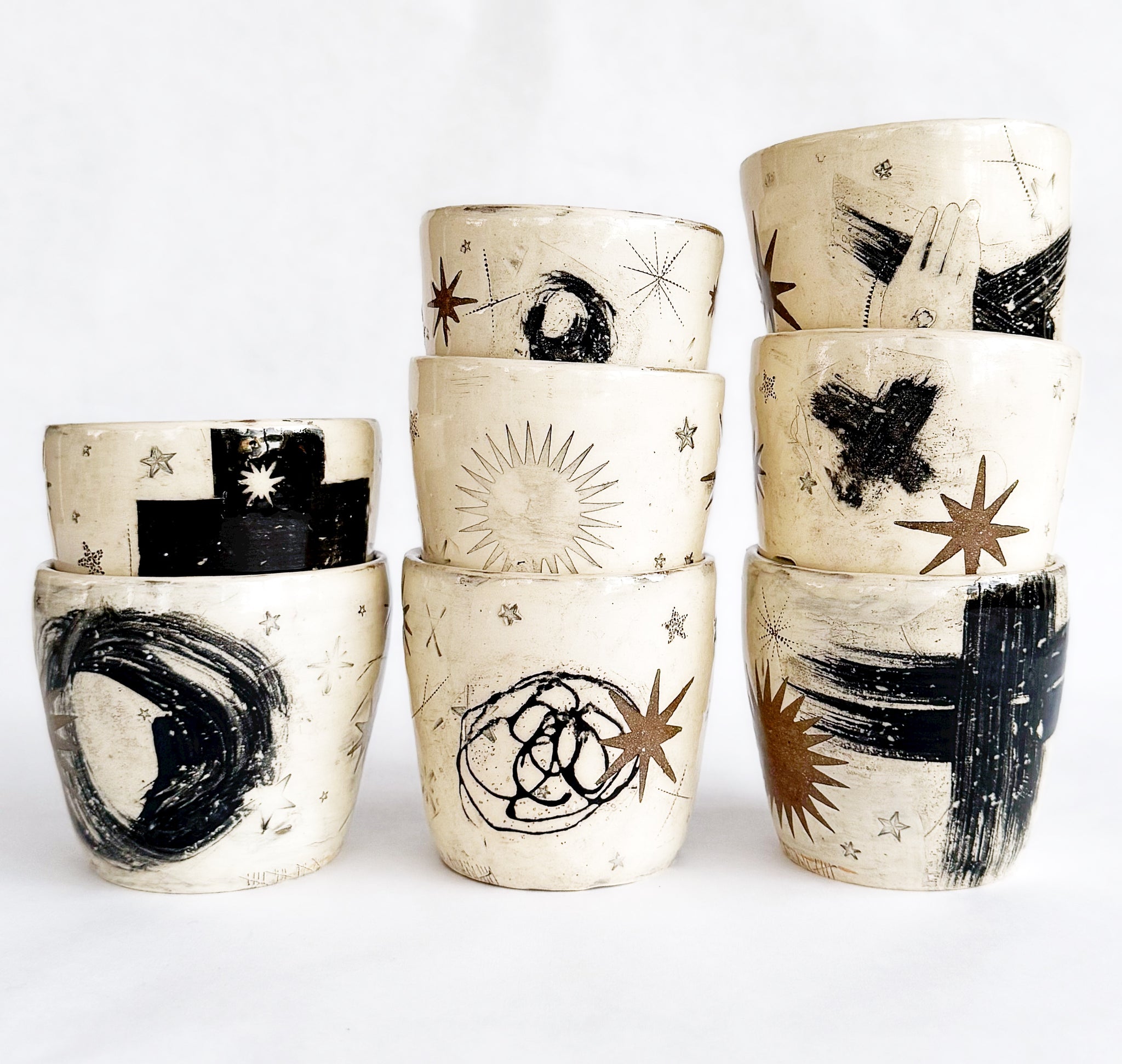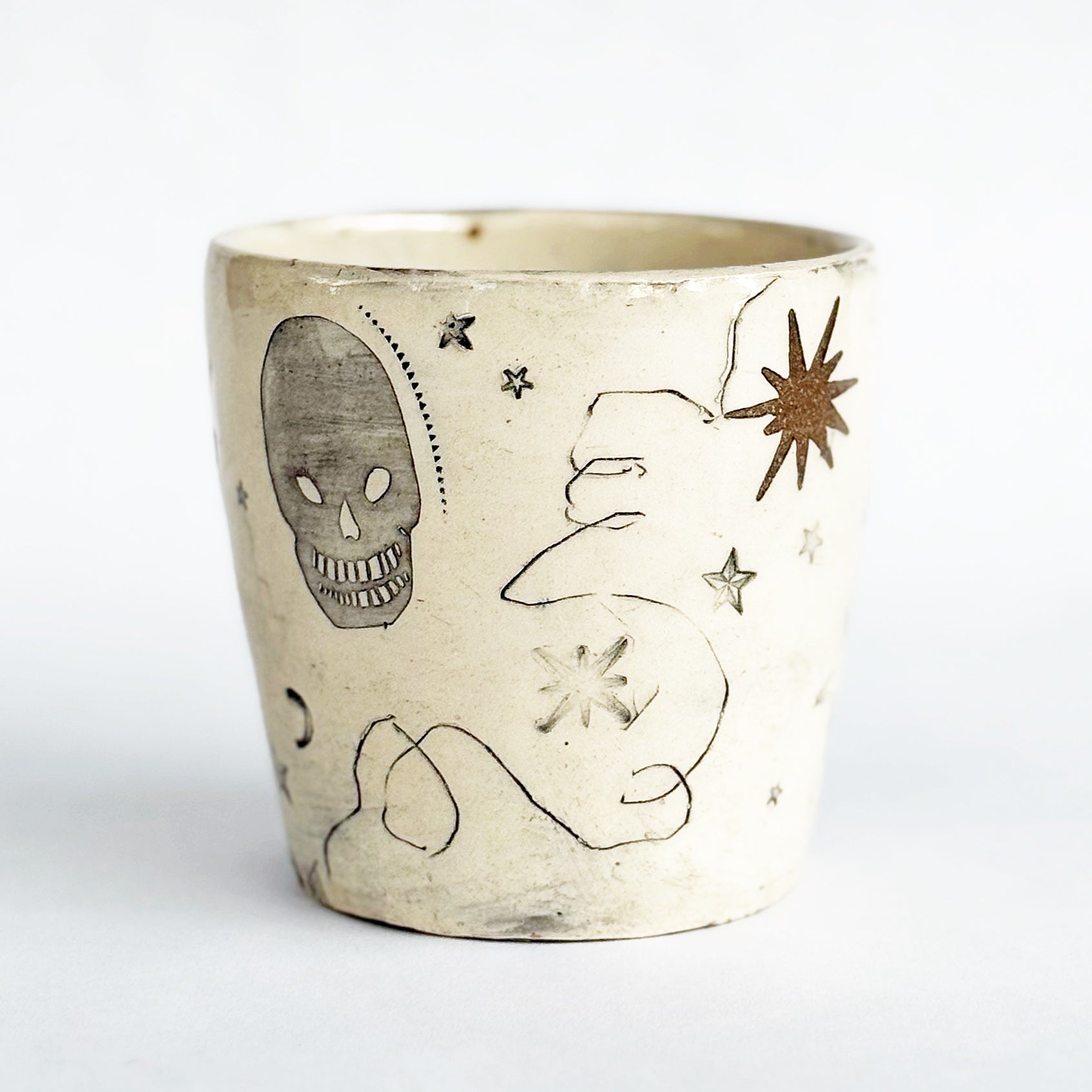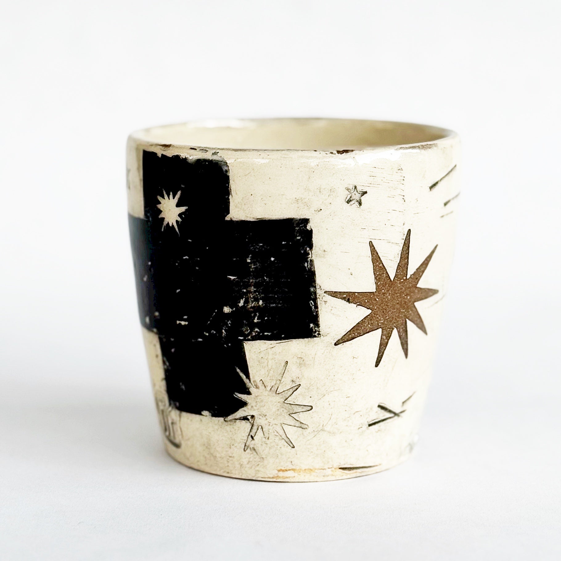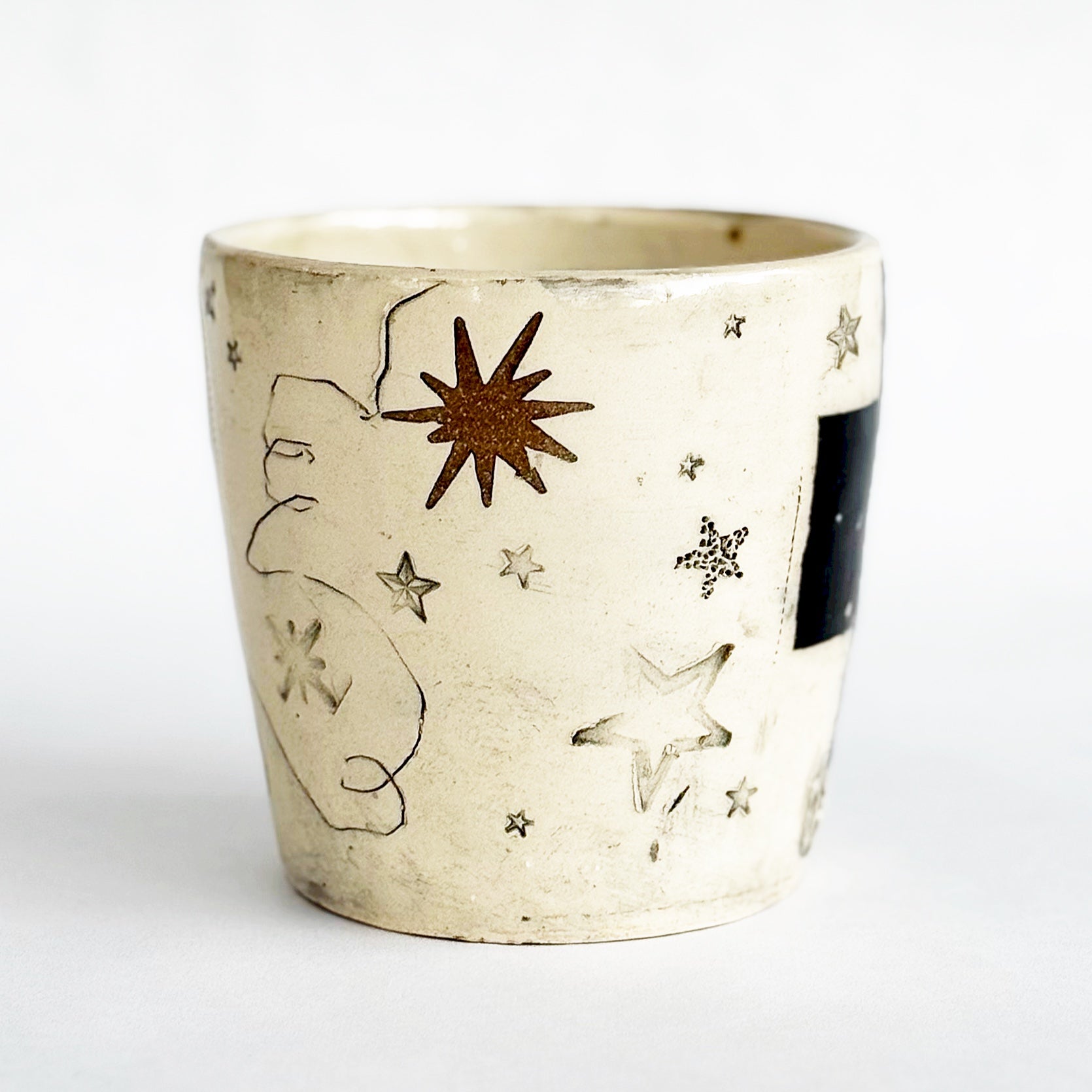 One of a kind, wheel thrown cup made from a toasty brown stoneware clay. Decorated with ivory slip, hand drawn and cut stencils, handmade black underglaze transfers, hand etched, stamped, stained, and finished with a clear glaze. Fired to cone 6.