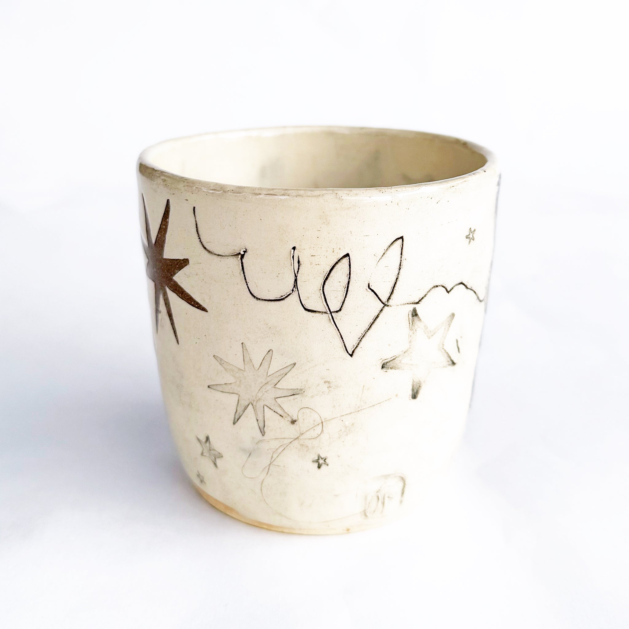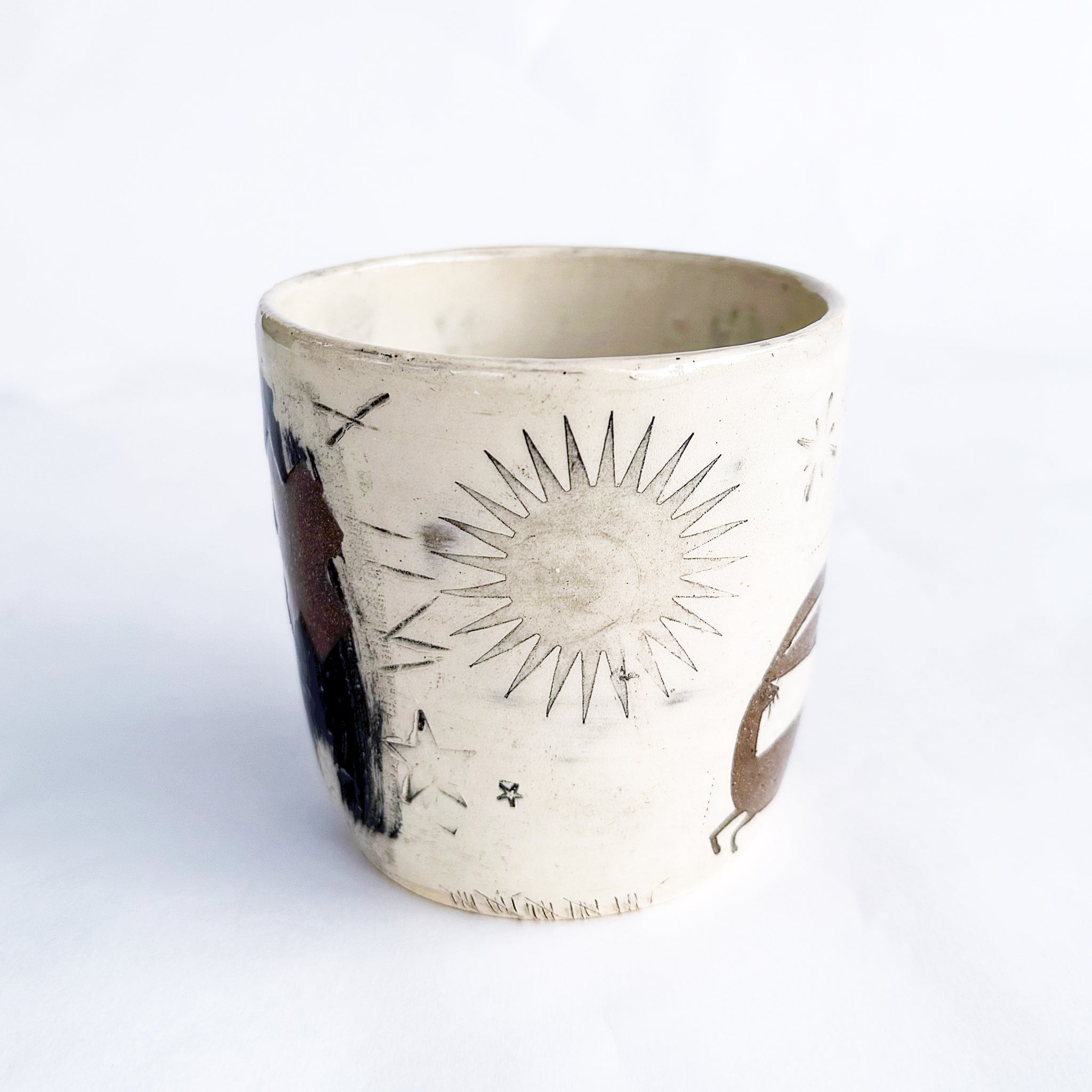 One of a kind, wheel thrown cup made from a toasty brown stoneware clay. Decorated with ivory slip, hand drawn and cut stencils, handmade black underglaze transfers, hand etched, stamped, stained, and finished with a clear glaze. Fired to cone 6.