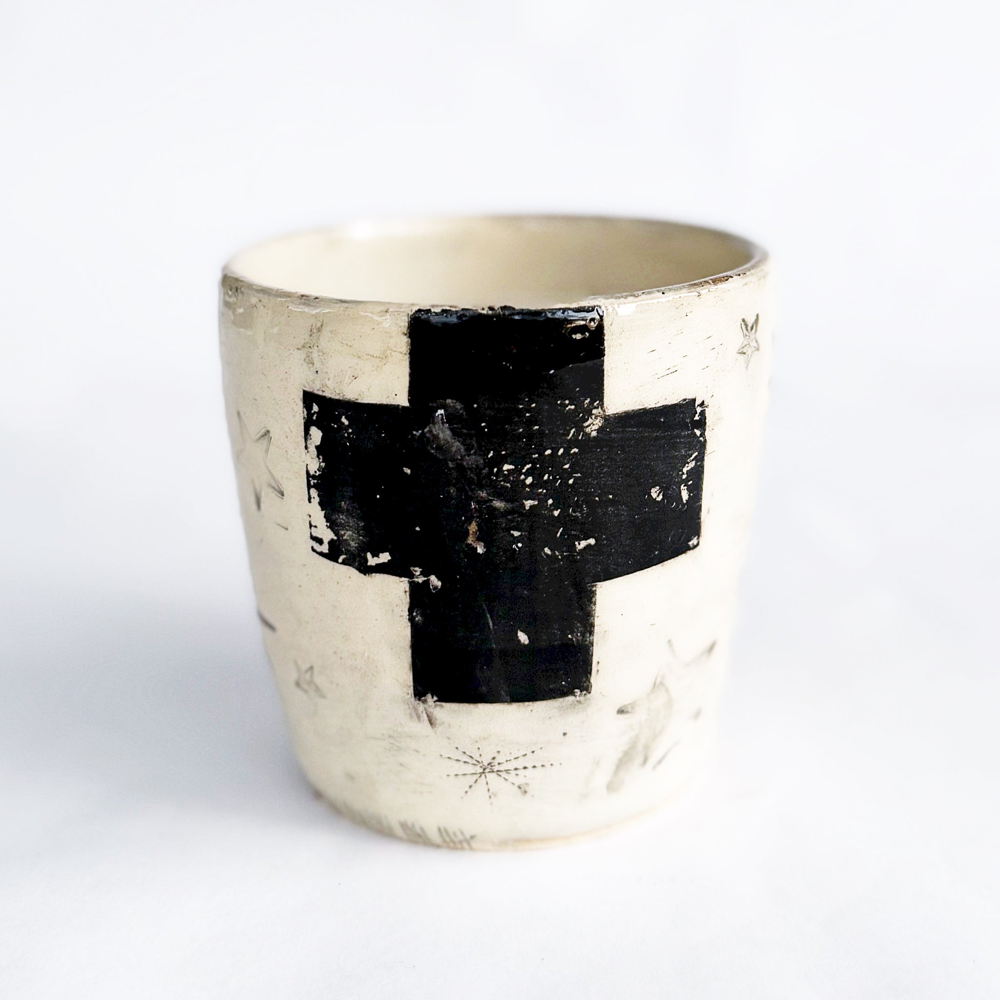 One of a kind, wheel thrown cup made from a toasty brown stoneware clay. Decorated with ivory slip, hand drawn and cut stencils, handmade black underglaze transfers, hand etched, stamped, stained, and finished with a clear glaze. Fired to cone 6.